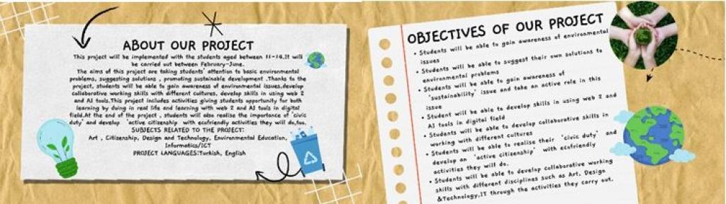 Projemizde öğrencilerimizin hem yaparak ve yaşayarak öğrenmelerini sağlayacak hem de yapay zeka ve web 2.0 araçlarını kullanarak dijital ortamda öğrenmelerine olanak sağlayacak etkinliklerimiz yer almaktadır. Çevre dostu etkinliklerle birlikte öğrencilerimizde “ vatandaşlık” bilincinin oluşmasını ve “vatandaşlık” konusunda aktif rol almalarını hedeflemekteyiz. Projemiz disiplinlerarası anlayışla beraber öğrencilerimizin farklı kültürlerle işbirliği halinde çalışma becerilerini ve yabancı dili öğrenme becerilerini geliştirmeye olanak sağlamaktadır.